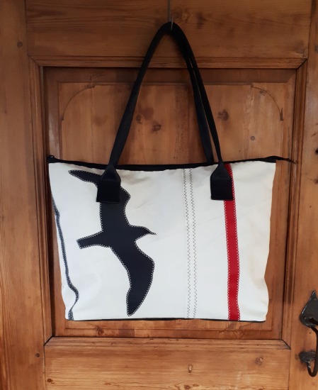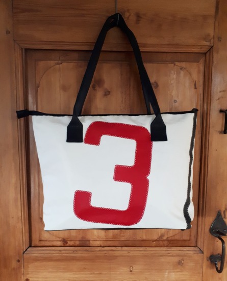 Meine Taschen werden von Hand zugeschnitten, die Taschenteile werden von mir einzeln verziert und erhalten ihr eigenes Design. Vorhandene Nähte, Kauschen, Lattentaschen, Dopplungen und Windfäden aus den Segeln werden mit in das Design übernommen. Alle von mir aufgeklebten Segelnummern und Trimmstreifen werden mit einer effektvollen Zickzacknaht aus Segelmachergarn umnäht.